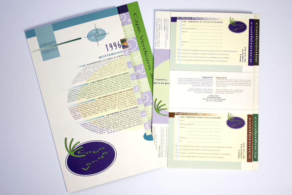 In 1996 heb ik in opdracht van de Gemeente Rotterdam - Externe Betrekkingen een flyer. brochure, conferentiemap en eindverslag vormgegeven. Het betrof een internationale conferentie over Kaapverdianen in Europese steden.