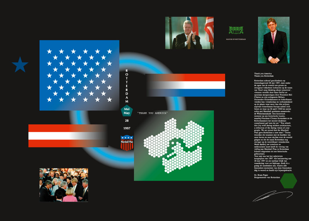In opdracht van de gemeente Rotterdam (Externe Betrekkingen) heb ik in 1997 een poster ontworpen ter nagedachtenis aan het bezoek van toenmalig president Clinton van de Verenigde Staten aan Rotterdam, ter gelegenheid van de viering van het 50 jarig jubileum van het Marshalplan. Er is ook een omdoos voor een videoproductie bij ontworpen (zie verpakkingen). Het geheel is als dank voor zijn bezoek als geschenk door toenmalig burgemeester van Rotterdam, Bram Peper aan de president overhandigd. Achterkant van de poster