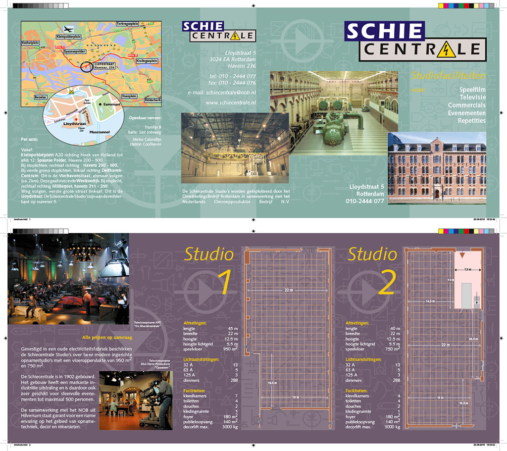 In opdracht van het Ontwikkelingsbedrijf Rotterdam (OBR) heb ik in 2000 de huisstijl ontwikkeld voor de Schiecentrale Studio's in Rotterdam. Naast briefpapier, enveloppen, visitekaartjes en een website heb ik ook een folder vormgegeven in een Nederlands en een Engelse versie.