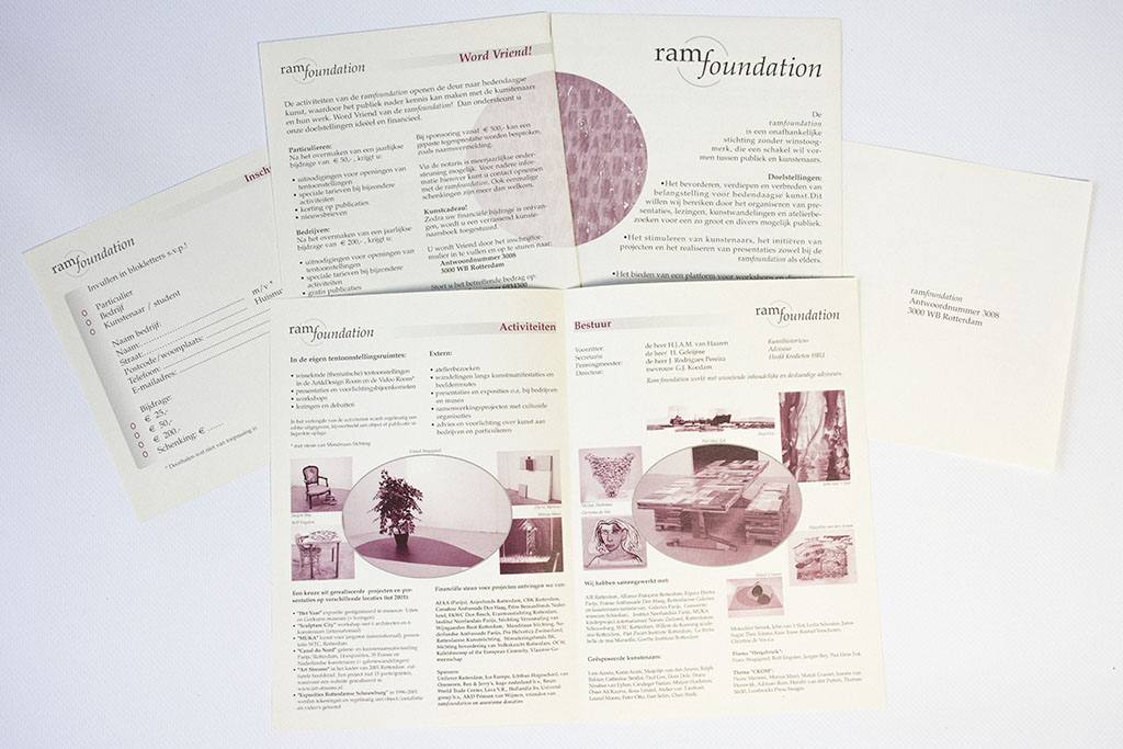 Vanaf 1990 ben ik betrokken geweest bij RAM en ramfoundation. Vanaf 1995 t/m 2015 heb ik alle grafische vormgeving verzorgd.>Huisstijlen, uitnodigingen, nieuwsbrieven, brochures etc.