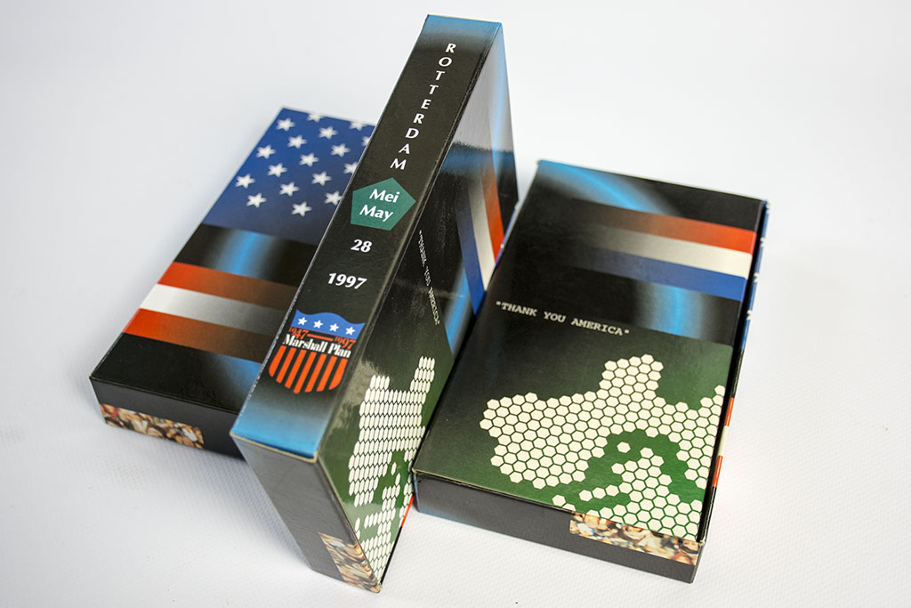 In opdracht van de gemeente Rotterdam (Externe Betrekkingen) heb ik in 1997 een omdoos ontworpen voor een videoproductie waarin het bezoek van toenmalig president Clinton van de Verenigde Staten aan Rotterdam gevolgd wordt, ter gelegenheid van de viering van het 50 jarig jubileum van het Marshalplan. Er is ook een poster bij ontworpen (zie drukwerk). Het geheel is als dank voor zijn bezoek als geschenk door toenmalig burgemeester van Rotterdam, Bram Peper aan de president overhandigd.